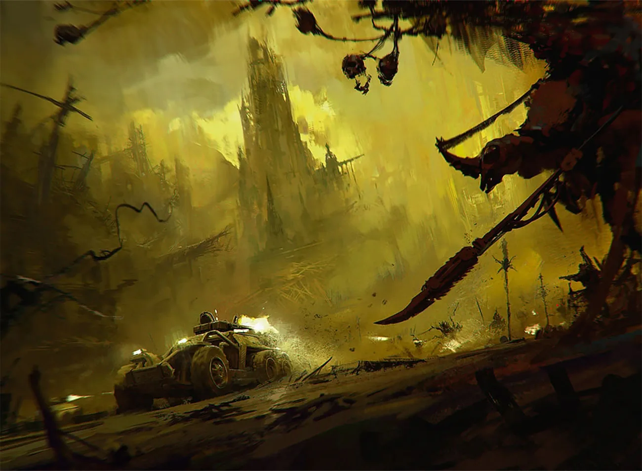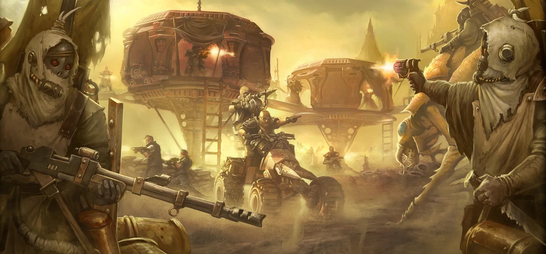 Surrounding the hives stretch the Ash Wastes, vast deserts of radioactive dust and toxic storms. Though deadly, they are essential to Necromunda's survival. Trade convoys crawl between hive cities, hauling supplies, weapons, and raw materials across the wasteland.
