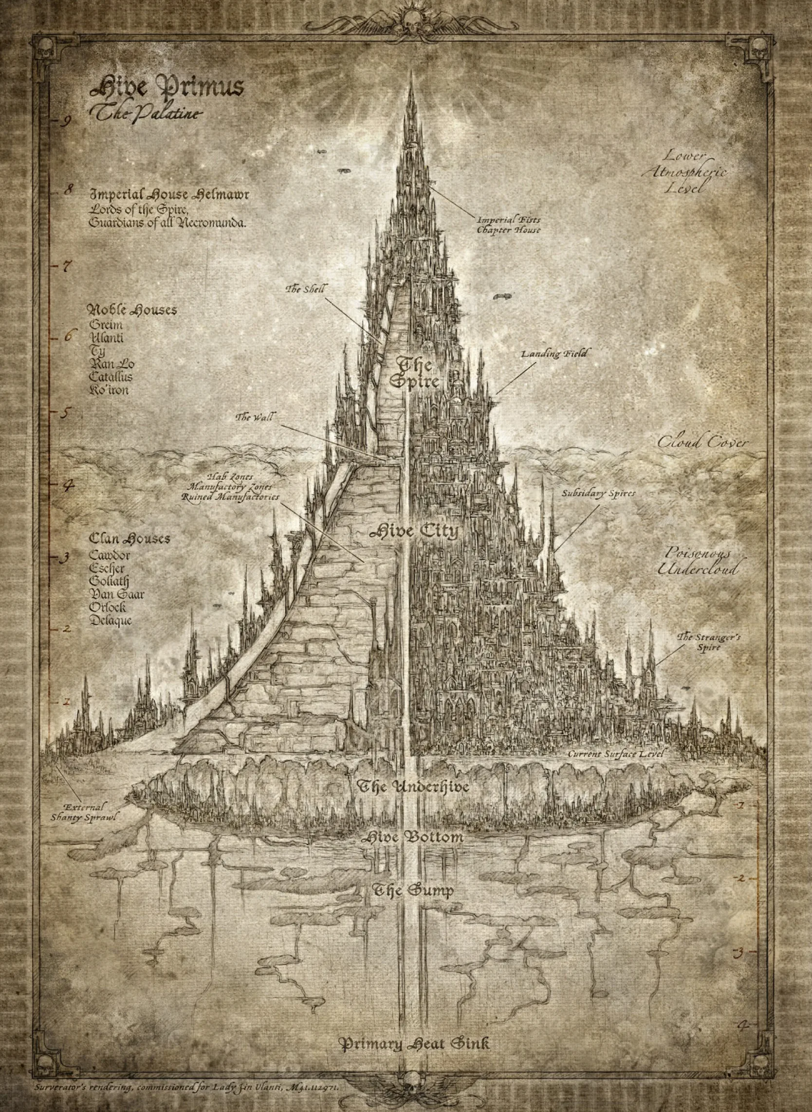 The Houses are locked in constant rivalry, carefully maintained to serve the reigning House Helmawr. Open war in the spires would threaten production, contracts, and the tithe owed to the Imperium, so conflict is pushed downwards, into the underhive, where it can be contained and exploited.