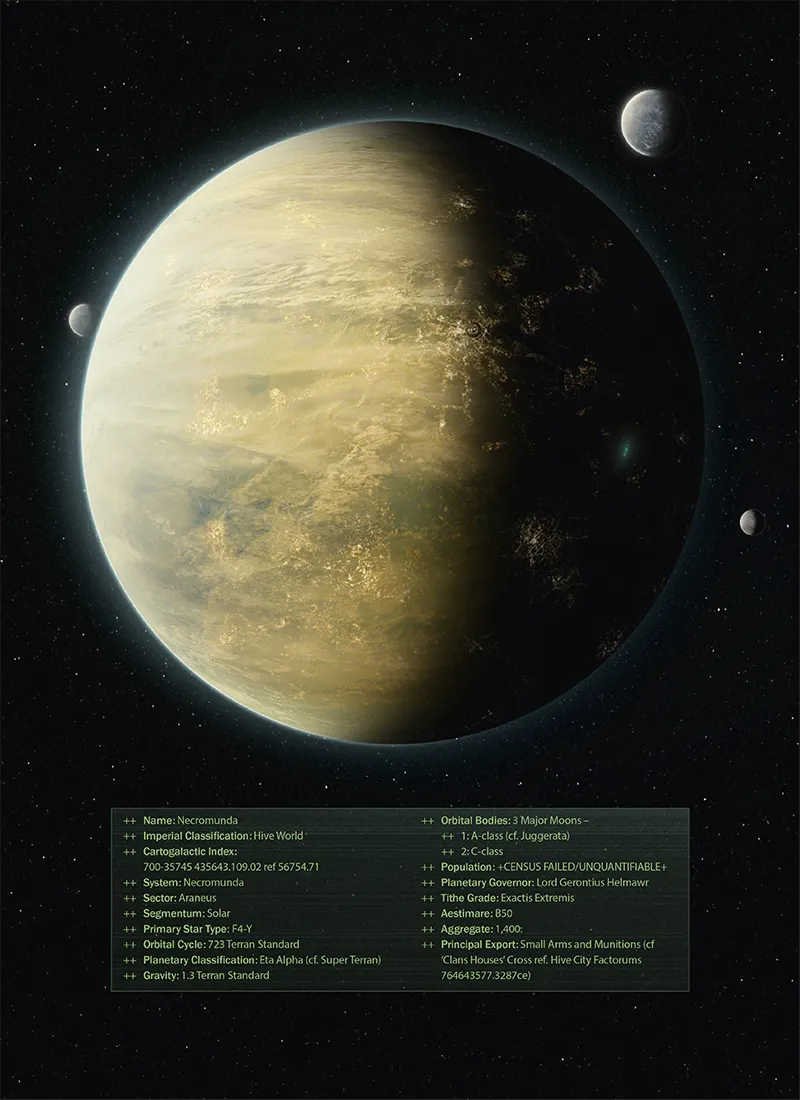 The planet is an engine of production. Mines, refineries, factories, and processing plants blanket its surface and plunge deep into its crust. Every resource is exploited, every scrap repurposed. Nothing is allowed to go to waste if it can be made to serve the Imperium.